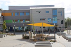 Eingerückt auf vorhandene Gebäudefluchten, parallel zur Grundstücksgrenze wird eine dreigeschossige Gebäudespange als Schutz der benachbarten Wohnbebauung und zur Herstellung eines campusartigen Schulhofs etabliert. Die Spange includiert Klassen- und Horträume. 3-geschossig schließen in Richtung des Innenhofes Funktionsräume und Treppenhaus an. Fensterflächen der Klassenräume orientieren grundsätzlich nach Südosten. Ebenerdigkeit legt den Verzicht auf Hierarchien baulich an.